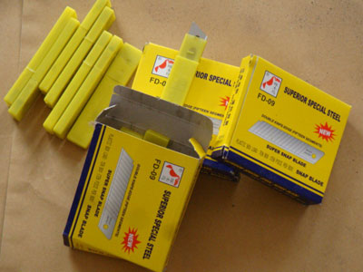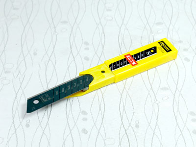 美工刀也俗稱刻刀或壁紙刀,是一種美術和做手工藝品用的刀,主要用來切割質(zhì)地較軟的東西,多為塑刀柄和刀片兩部分組成,為抽拉式結構。也有少數(shù)為金屬刀柄,刀片多為斜口,用鈍可順片身的劃線折斷,出現(xiàn)新的刀鋒,方便使用。美工刀有大小多種型號。